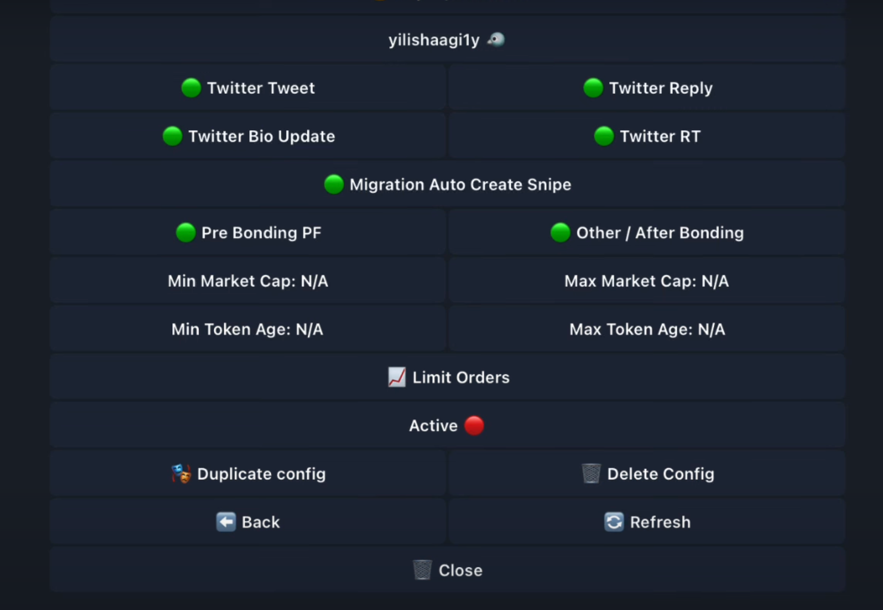 - For Solana and Ethereum, ensure you’ve configured the token pairs you want to trade and the conditions under which you’d like to enter and exit positions.